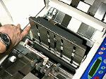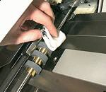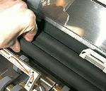 Jetzt können Sie noch die Gummirollen an den Einzugsschächten reinigen, einfach die Fächer aus der Maschine nehmen und mit dem Reiniger die Einzugsrollen säubern. Eine Reinigung der Gummiwalzen empfehlen wir auch am Kuverteinzug, am Beilagenschacht und am Maschinenausgang.