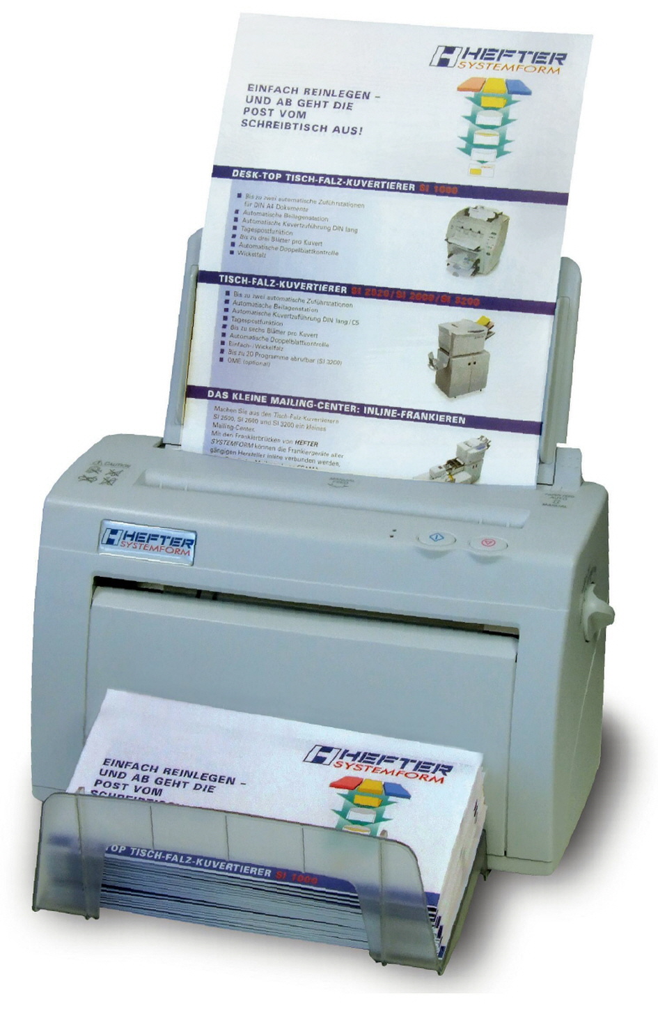 Bis zu drei Briefbögen die geheftet sein können, werden an den Einzugsschacht herangeführt.