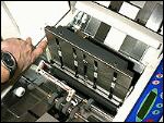 Jetzt können Sie noch die Gummirollen an den Einzugsschächten reinigen, einfach die Fächer aus der Maschine nehmen und mit dem Reiniger die Einzugsrollen säubern. Eine Reinigung der Gummiwalzen empfehlen wir auch am Kuverteinzug, am Beilagenschacht und am Maschinenausgang. |