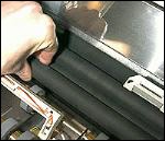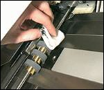 Sie sehen jetzt 3 Gummiwalzen. Diese Gummiwalzen falzen die Dokumente. Nehmen Sie ein mit dem Walzenreiniger angefeuchtetes Vliesstoff Pad und säubern Sie damit die Walzen. Mit einer Hand können Sie die Walzen drehen, so dass alle Walzen gleichmäßig gereinigt werden. Wir empfehlen, die Falzrollen alle 5.000 Kuvertierungen zu reinigen. Setzen Sie jetzt die Falztasche wieder ein, bis sie unten einrastet. (ohne Gewalt!!!) |