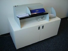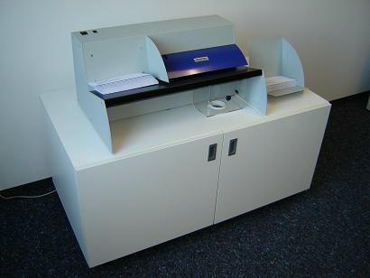 Kuvertablage! Standardmäßig ist unser OL 500 mit einem kleinen Auffangkorb ausgestattet. Mit 2 Händen bestücken, mit 2 Händen das geöffnete Postgut entnehmen ...