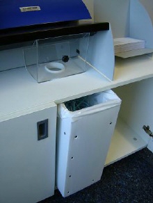 Ordentlich im rollbaren Unterschrank verstaut. Der Auffangbehälter wird mit einem Abfallsack bestückt, damit sich bei der Entleerung nicht der Papierstaub in Ihrem Arbeitsbereich verteilen kann!