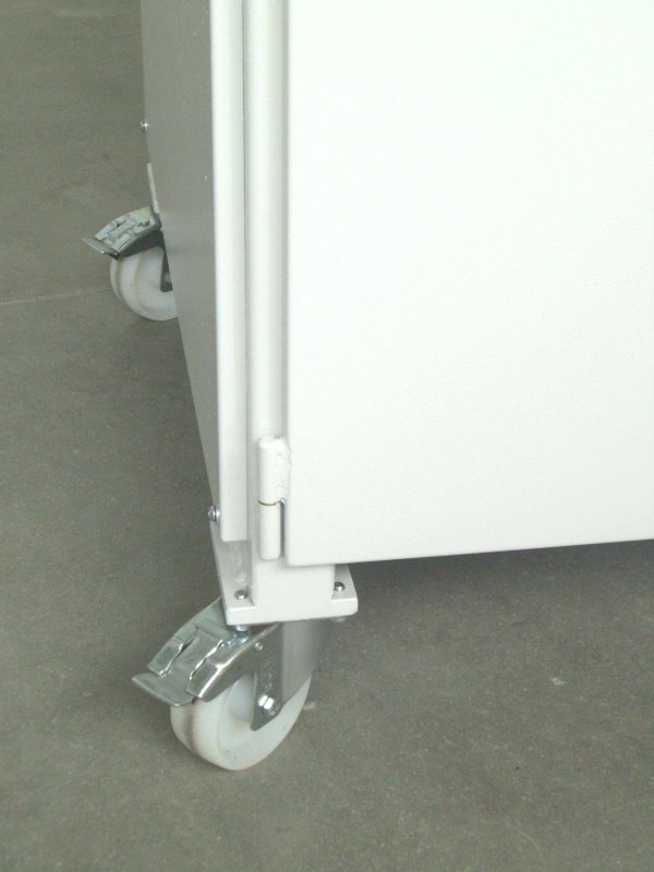 Untergestell für 120 l Standard-Container (nicht im Preis inbegriffen). Der Schaltschrank ist platzsparend im Maschinenrahmen integriert.